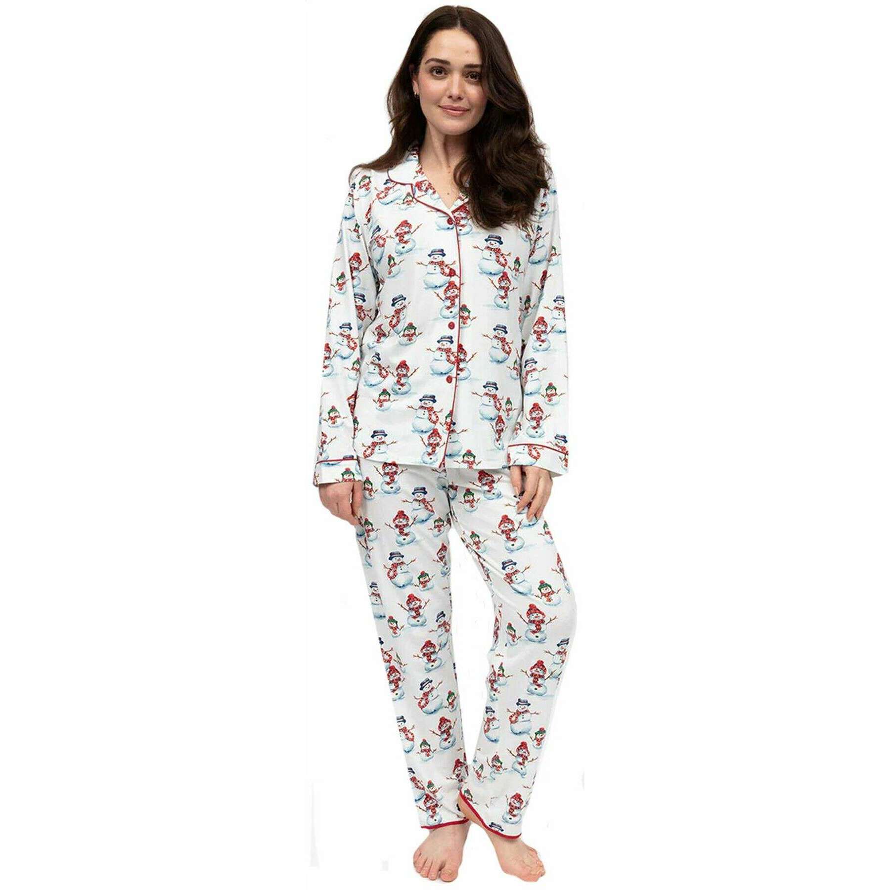 Dessa snögubbetryckta pyjamasset för kvinnor från märket Cyberjammies är gjorda av 52 % bomull, 41 % modal och 7 % elastan och visas i rött. Även den vita/röda pyjamasen är designad i ett unikt mönster. Det rekommenderas att maskintvätta ut och in, inte blötlägga, tvätta med liknande färger för att hålla dessa pyjamasar i gott skick. Alla pyjamas kommer komplett med cyberjammies taggar. Cyberjammies Blaze Snowman Printed Pyjamas Set - Vit/Röd säkerställer att du kan fira högtiden bekvämt. Tillverkad av en mjuk bomull-modal-elastanblandning, detta set har ett glatt snögubbetryck på en vintervit bas, kantad med knallröda kanter för en polerad finish. Toppen har en vördnadskrage, ärmslut och täckta knappar, medan nederdelen har en elastisk rygg, platt framsida, justerbar dragsko och sidfickor. Perfekt för mysiga kvällar, familjefoton eller helt enkelt lägga till en touch av festlig glädje till din slappa.