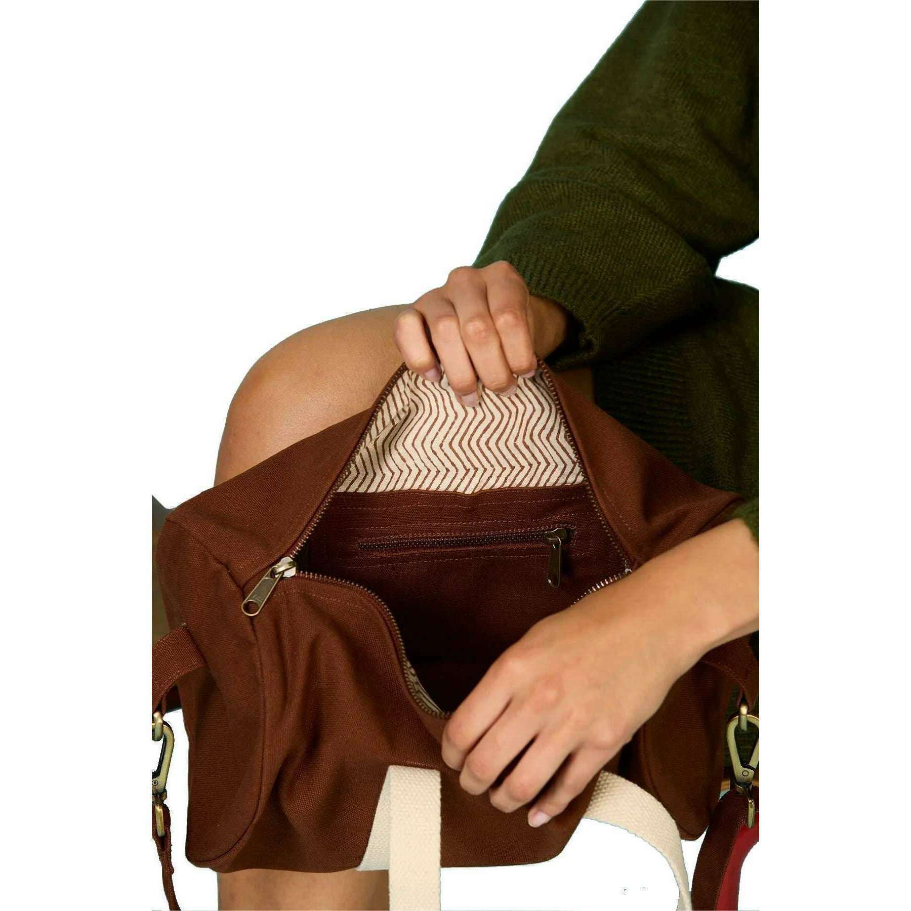 Med hjälp av brun 100% organisk bomull är denna mini Simon lilla duffelväska med bakväska perfekt för män eller kvinnor och ett måste. Den mäter 18 cm (höjd) x 35 cm (bredd) x 18 cm (djup). Alla väskor levereras kompletta med bakpåsförpackning. Hindbag Mini Simon Small Duffle Bag - Chocolate Brown är en mångsidig och miljömedveten resekamrat som är utformad för dem som söker funktionalitet utan att kompromissa med stil. Med en yttre dragkedja och justerbar axelrem för komfort erbjuder denna duffelväska gott om utrymme för väsentlighet samtidigt som man håller en elegant profil, vilket gör den idealisk för weekendresor, gymnastiksessioner eller dagliga pendlar.