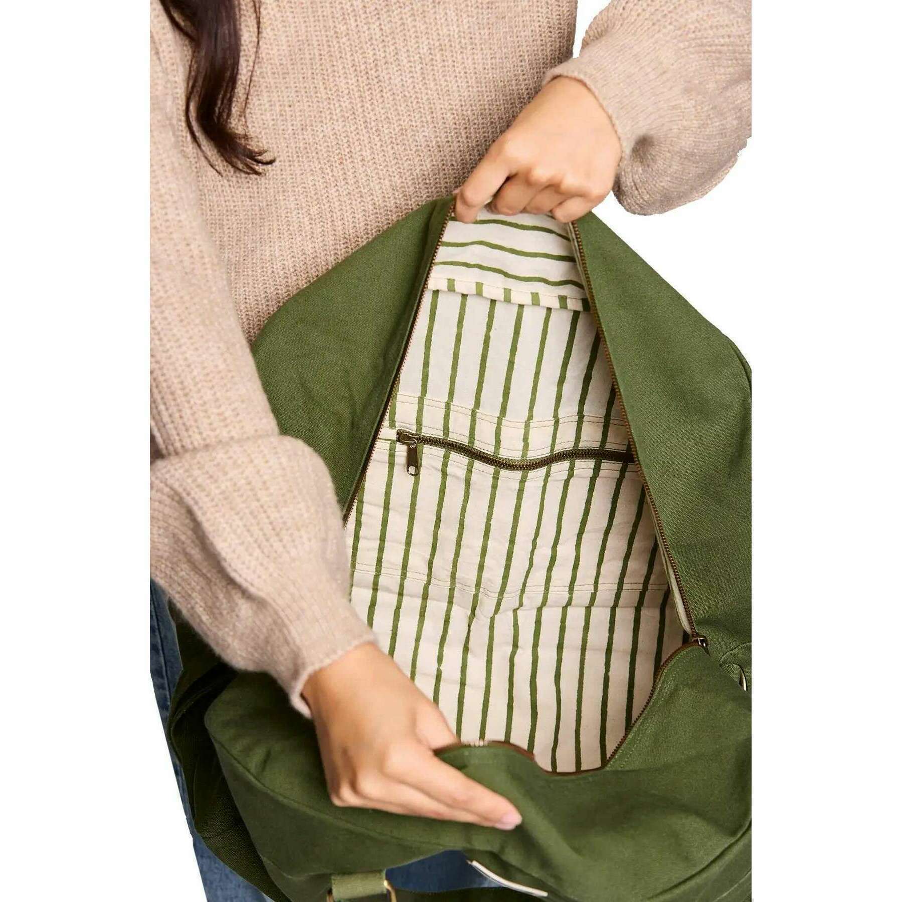 Tillverkad av 100% organisk bomull är denna olivgröna unisex yves stora resväska av designern bakpås. Den mäter 33 cm (höjd) x 54 cm (bredd) x 24 cm (djup). Alla väskor levereras kompletta med bakpåsförpackning. Hindbag Yves Large Travel Bag - Olive Green är ett rymligt och miljövänligt alternativ för resenärer. Denna väska är utformad från tjocka, gots-certifierade organiska bomull och har flera fickor för organisation, en säker dragkedja och ett tryckt inre foder som ger en touch av elegans. Med sina handtag och stora justerbara axelrem kan denna väska enkelt bäras för hand eller på axeln.