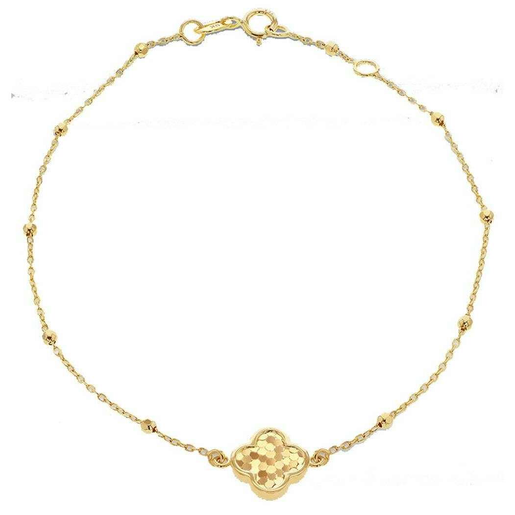 Detta discoklöver justerbara spår- och bollarmband för kvinnor har gjorts av 9 karat gult guld, presenterat i en guldfärg och är från märket KJ Beckett. Alla armband kommer komplett med förpackning. KJ Beckett Disco Clover justerbara spår- och bollarmband - gult guld ger en touch av tur och gnistra till din handled! Med ett strukturerat, facetterat klövermotiv som fångar ljuset vackert, ger detta justerbara spår- och bollarmband en lekfull elegans till varje look. Perfekt för vardagsbruk, stapling eller present, detta charmiga armband kombinerar tidlös stil med en rolig, modern twist.