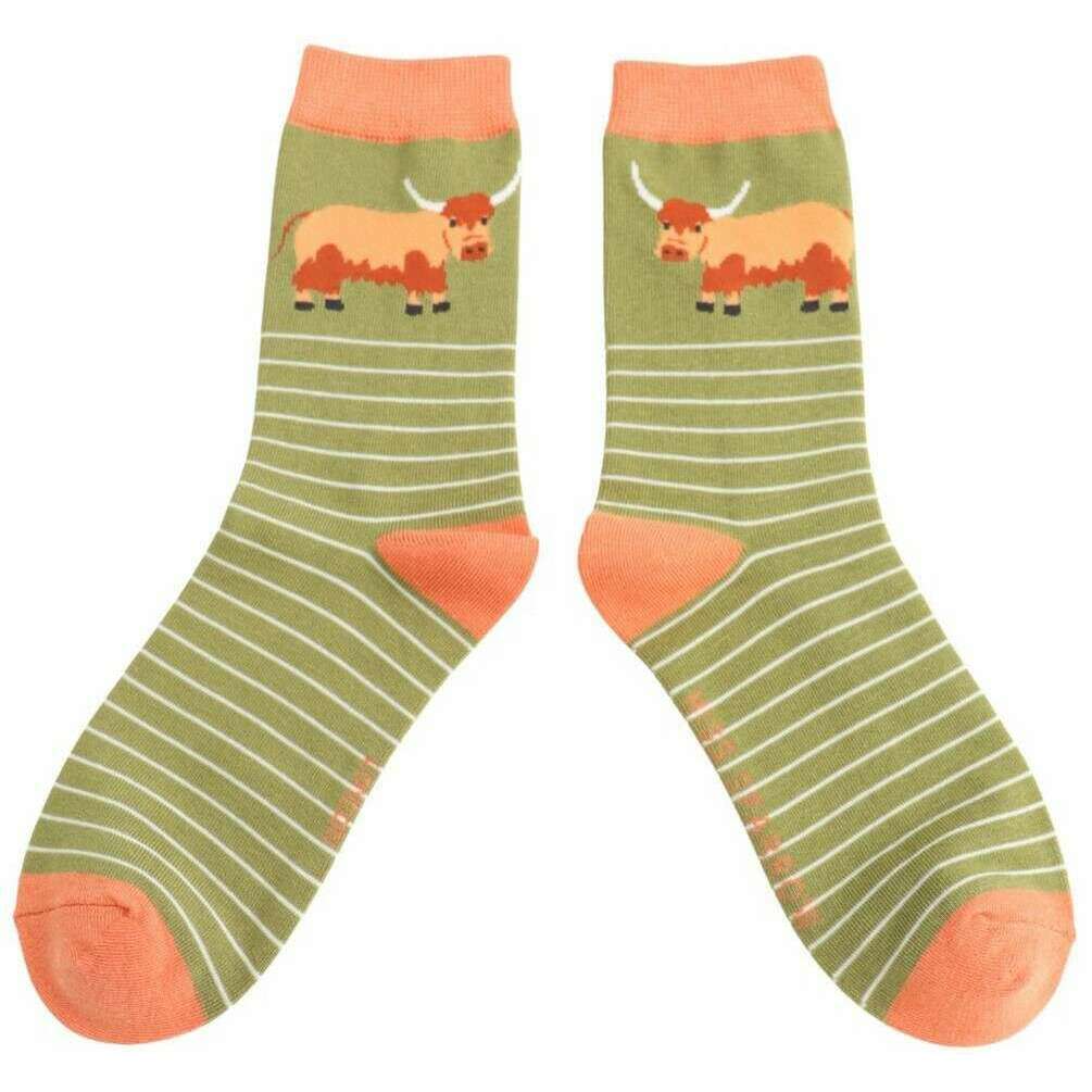 Miss Sparrow London Highland Cow and Stripes Bamboo Socks - Moss Green
