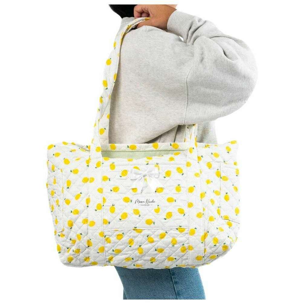 Denna läskväska för kvinnor är gjord av märket Moon Nude i en vit färg och är gjord av 100% bomull. Den mäter 30 cm (höjd) x 42 cm (bredd) x 12 cm (djup). Det rekommenderas att tvätta för hand i kallt vatten med ett milt rengöringsmedel, eller maskintvätt ut och in på ett ömtåligt program. för att hålla denna väska i gott skick. Alla väskorna levereras kompletta med moon nude-förpackning. Moon Nude Lemonade Tygväska - Vit/Gul har en vacker handgjord quiltad design. Perfekt för på språng, oavsett om det är för resor eller vardagsbruk. Denna väska har en dragkedja för säkerhet, långa axelremmar för komfort och en rymlig interiör för alla dina tillhörigheter.