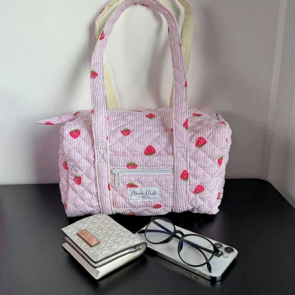 Denna strawberry mini kappsäck för kvinnor av märket Moon Nude är gjord av 100 % bomull och visas i rosa. Den mäter 18 cm (höjd) x 31 cm (bredd) x 18 cm (djup). Det rekommenderas att tvätta för hand i kallt vatten med ett milt rengöringsmedel, eller maskintvätt ut och in på ett ömtåligt program. för att hålla denna väska i gott skick. Alla väskorna levereras kompletta med moon nude-förpackning. Moon Nude Strawberry Mini Duffel Bag - Rosa/Röd har en vacker handgjord quiltad design. Den här väskan har en yttre ficka med dragkedja, en rymlig interiör och två stora handtag, perfekt för en ledig väska eller som present.