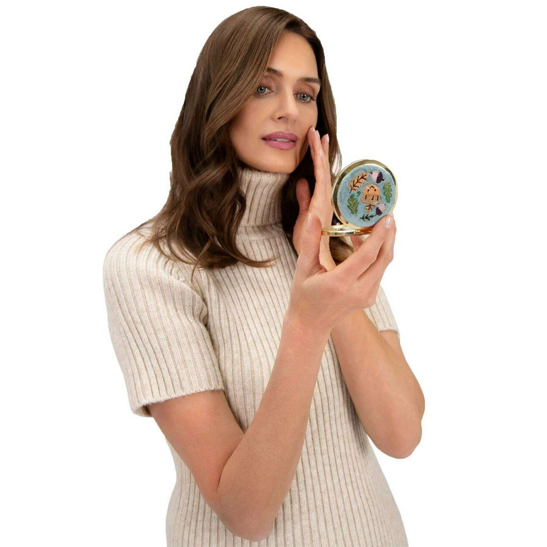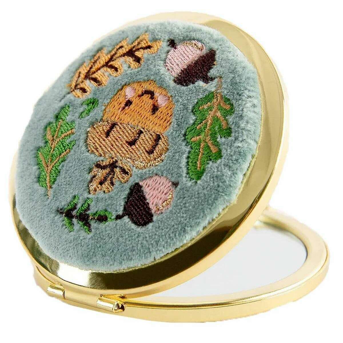 Pulver broderad lycklig ekollon kompakt spegel - isblå