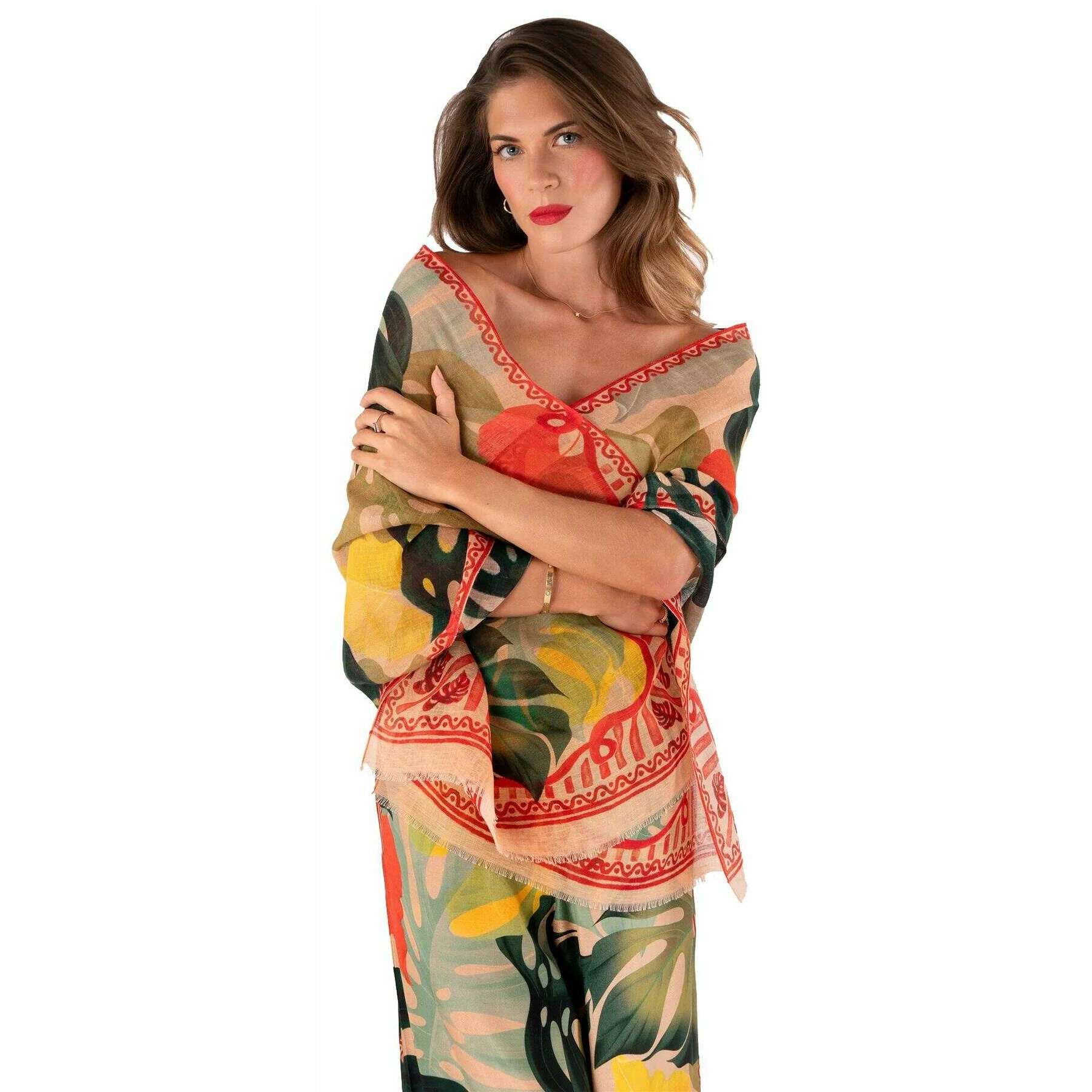 Powder Exotic Leaves Linne bomullssjal - Beige/Röd/Blå