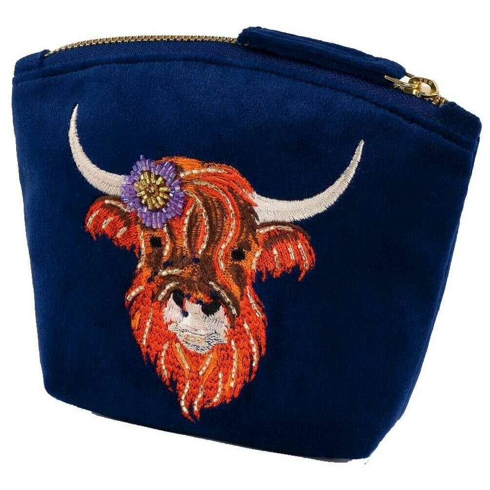 Powder Highland Cow Broderad Velvet Mini Pouch - Marinblå/Orange/Beige