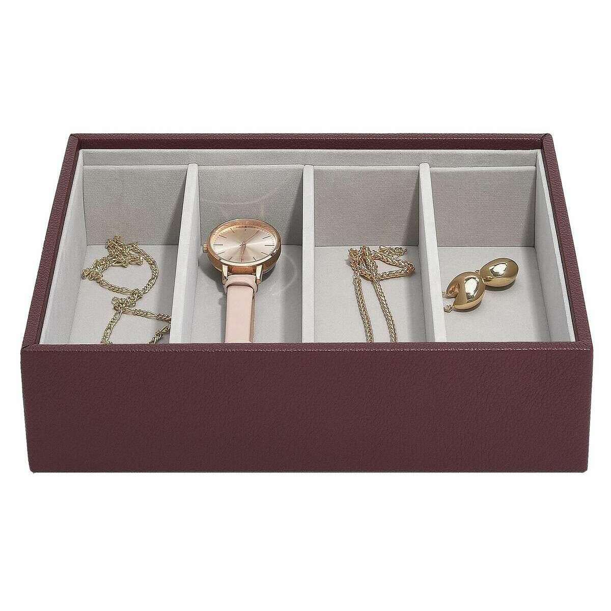 Detta tillbehörslager för klassiska glasögon för kvinnor av märket Stackers är gjord av konstläder och sammet och visas i vinrött. Den mäter 6 cm (höjd) x 25 cm (bredd) x 18 cm (djup). Alla smyckeskrin levereras kompletta med staplarförpackningar. Stackers Classic Glasses Accessory Layer - Burgundy har fyra större sektioner för alla dina större smycken. Detta vackra vinröda smyckeslager är perfekt för förvaring av större föremål som solglasögon, klockor och armringar.