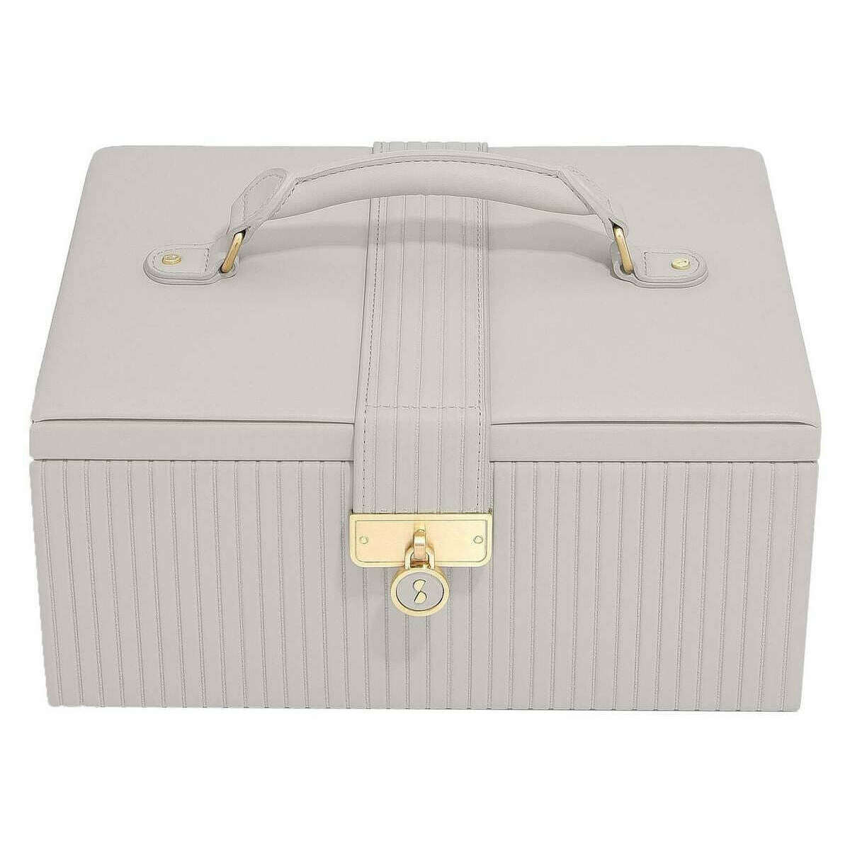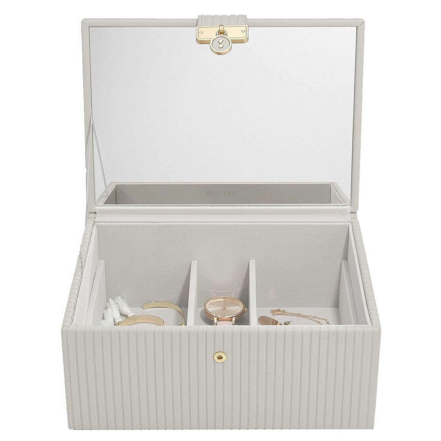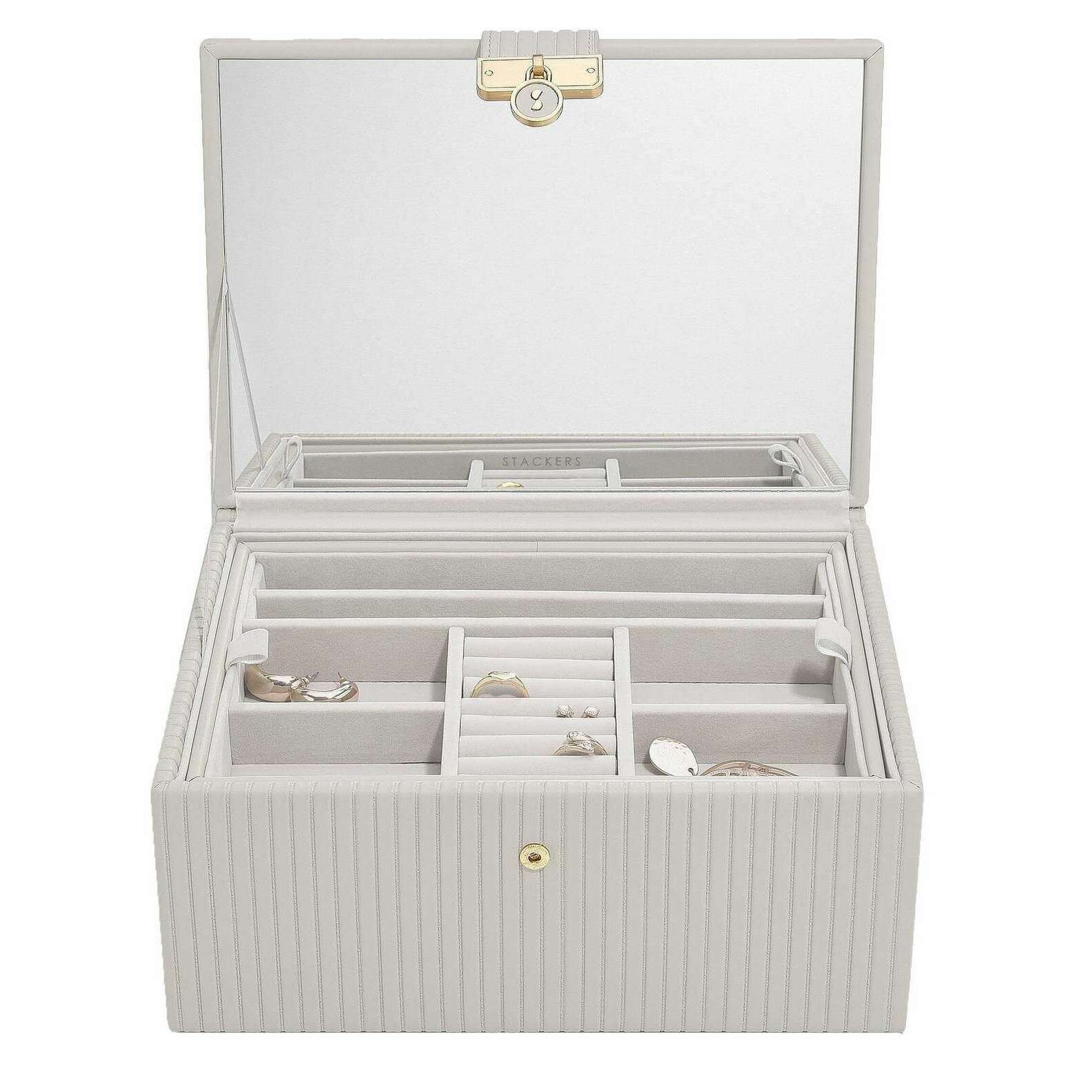 Denna klassiska smyckeskrin för kvinnor är formad av märket Stackers i en grå färg och är gjord av konstläder och sammet. Den mäter 16,3 cm (höjd) x 25 cm (bredd) x 18 cm (djup). Alla smyckeskrin levereras kompletta med staplarförpackningar. Stackers Classic Smyckeskrin - Limestone Grey har en vacker grå räfflad design, vilket ger denna smyckeskrin en stilig och sofistikerad look. Komplettera med ringrullar för ringar och örhängen samt en större sektion undertill för tjockare smycken och accessoarer.