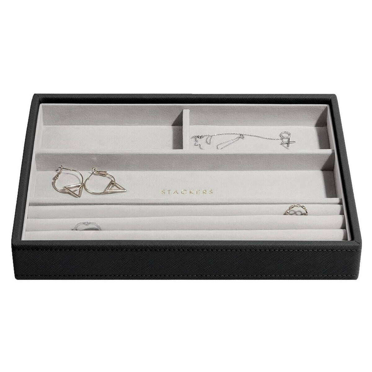 Introducerar denna klassiska uppsättning av 4 smyckeskrin för kvinnor från Stackers, den är tillverkad av konstläder och sammet i en svart raffiafärg. Den mäter 19,5 cm (höjd) x 25 cm (bredd) x 18 cm (djup). Alla smyckeskrin levereras kompletta med staplarförpackningar. Stackers Classic Set of 4 Smyckeskrin - Black Raffia har en unik design av svart raffia smyckeskrin. Denna smyckeskrin är perfekt för att förvara alla dina smycken! Levereras komplett med fyra lager och sektioner i flera storlekar för örhängen, ringar och armband och en större sektion för klockor och armband.