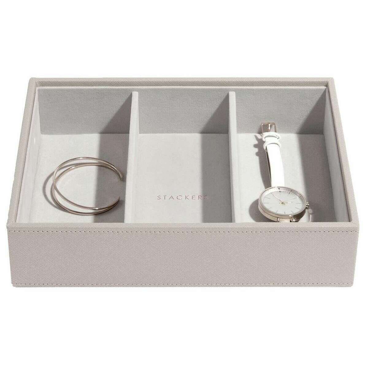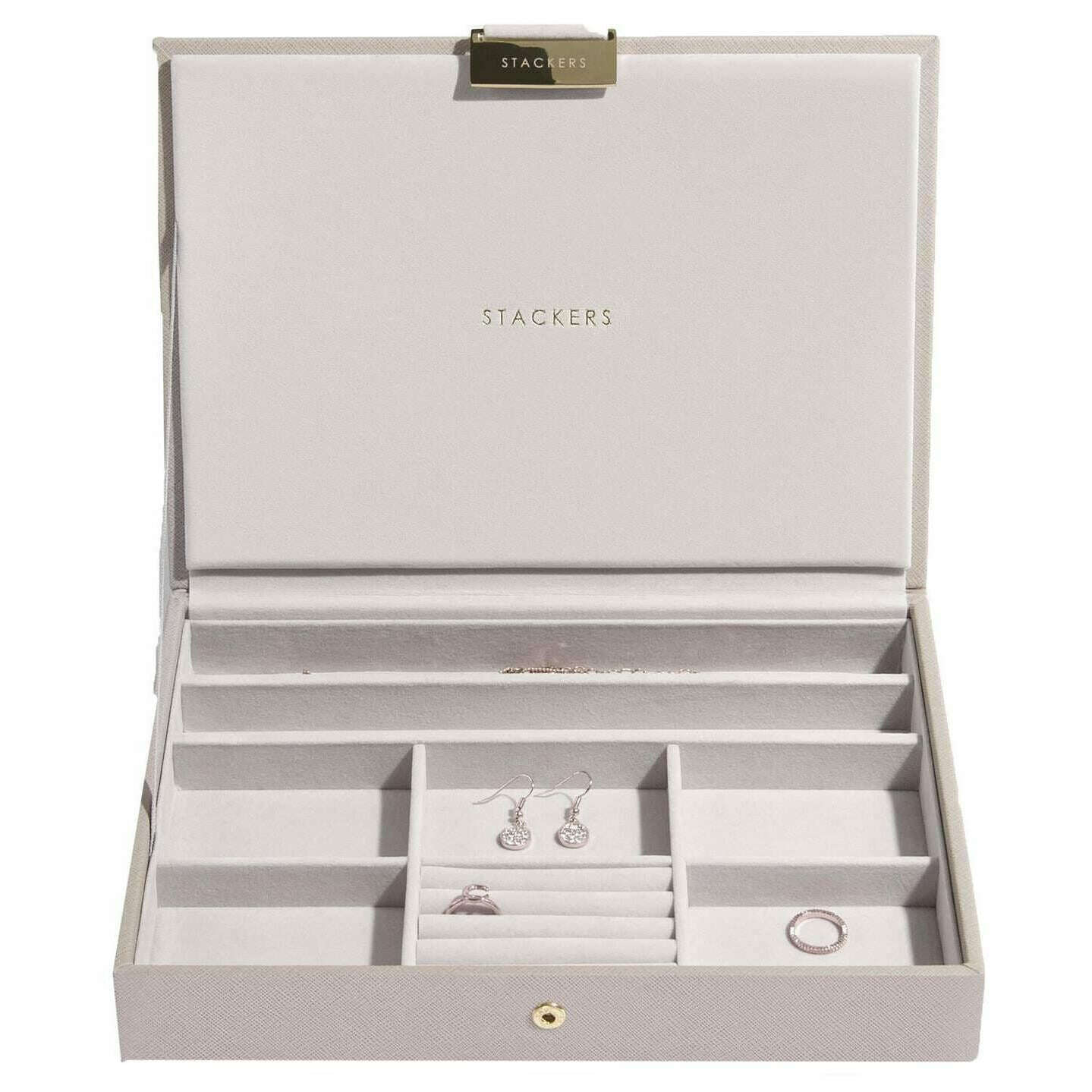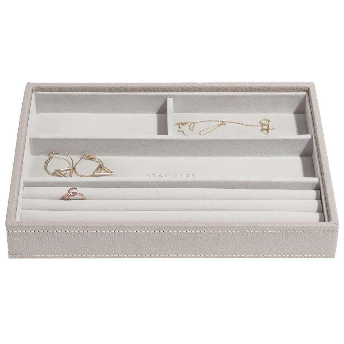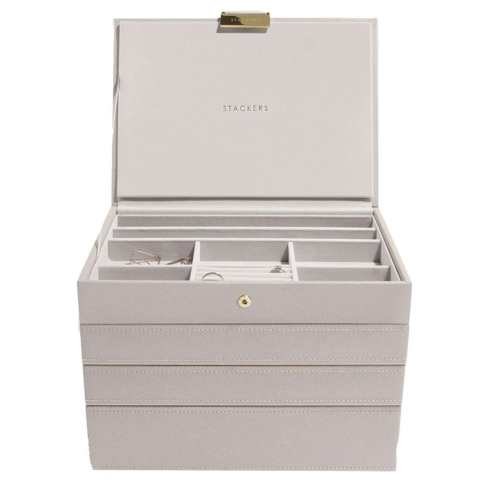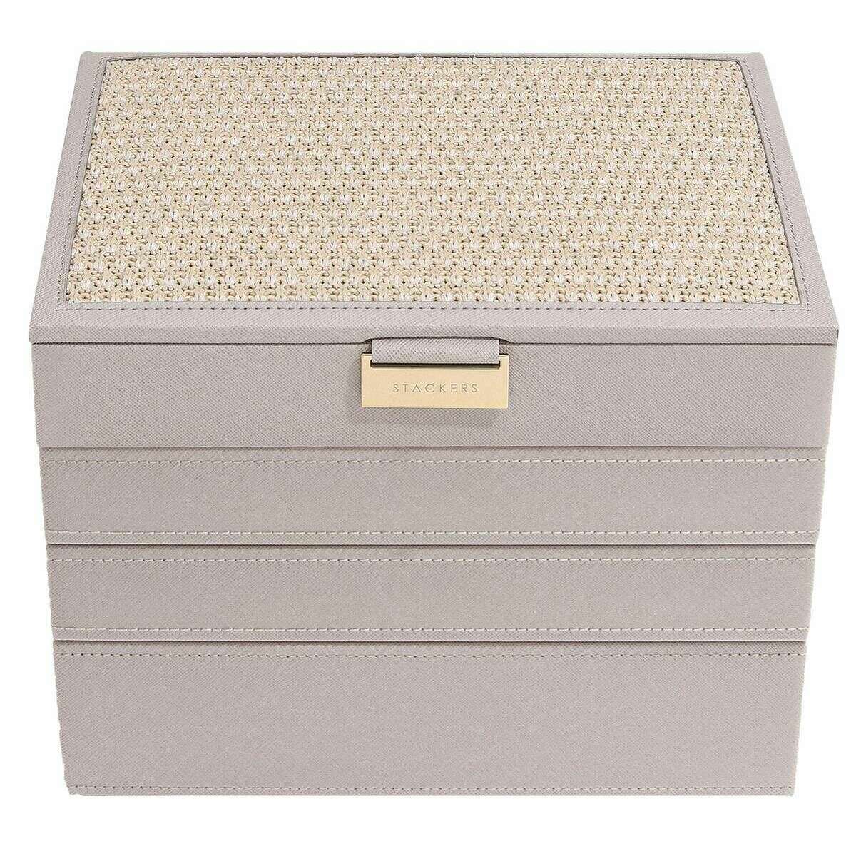 Designer Stackers har gett dig denna smyckeskrin i konstläder och sammet för kvinnor med taupe raffia-toner. Den mäter 19,5 cm (höjd) x 25 cm (bredd) x 18 cm (djup). Alla smyckeskrin levereras kompletta med staplarförpackningar. Stackers Classic Set of 4 Smyckeskrin - Taupe Raffia har en unik taupe raffia smyckeskrindesign. Denna smyckeskrin är perfekt för att förvara alla dina smycken! Levereras komplett med fyra lager och sektioner i flera storlekar för örhängen, ringar och armband och en större sektion för klockor och armband.