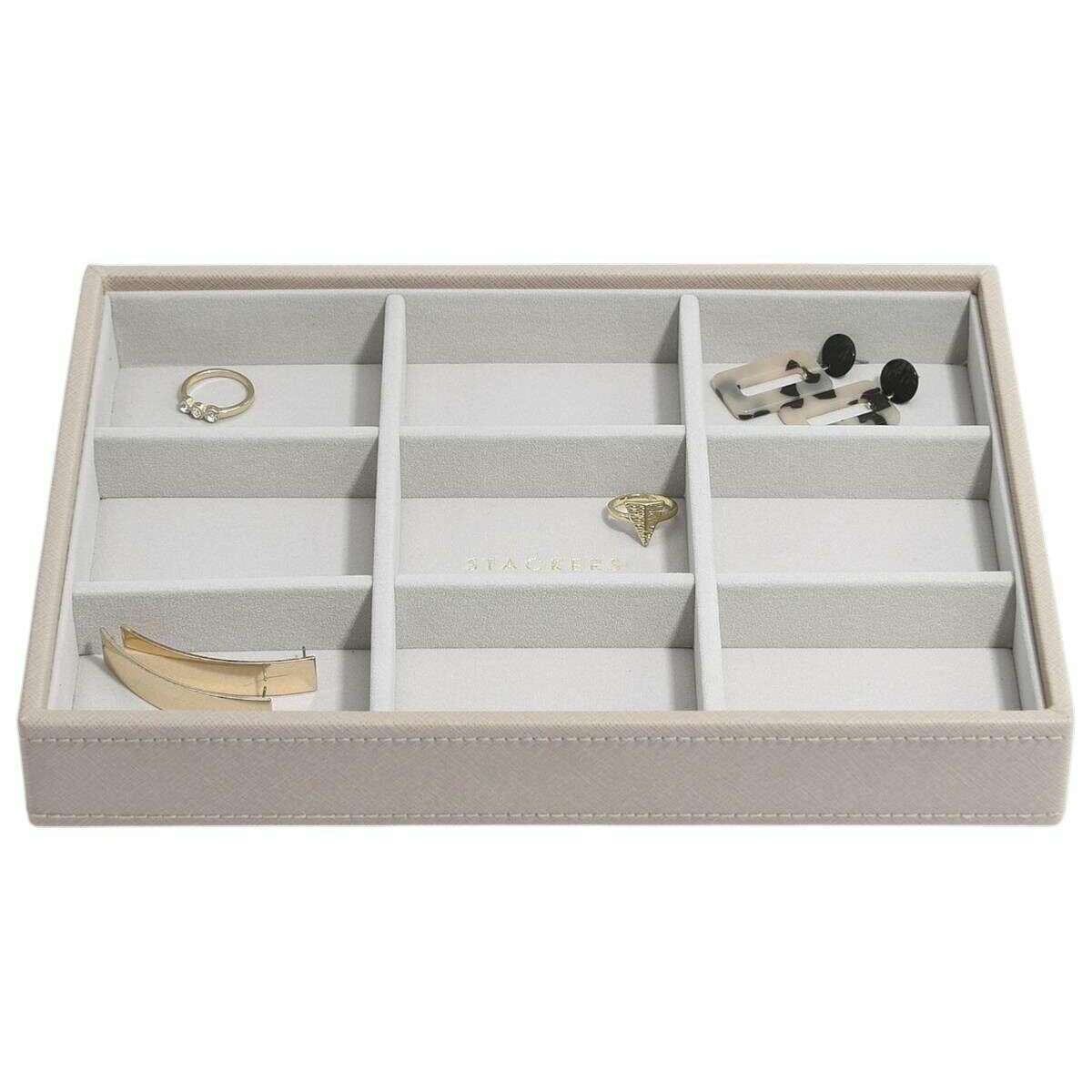 Perfekt för kvinnor är detta Stackers taupe beige klassiska statement-lager, det är också gjort av konstläder och sammet. Den mäter 3,7 cm (höjd) x 25 cm (bredd) x 18 cm (djup). Det rekommenderas att torka rent för att hålla denna smyckeskrin i gott skick. Alla smyckeskrin levereras kompletta med staplarförpackningar. Stackers Classic Statement Layer - Taupe Beige har skapats och designats för att hålla alla dina örhängen, ringar eller hårspännen perfekt. Den kan läggas till vilken annan klassisk smyckesbricka som helst för att skapa en smyckeskrin eller så kan den användas på egen hand. Du behöver inte kompromissa med organisationen.