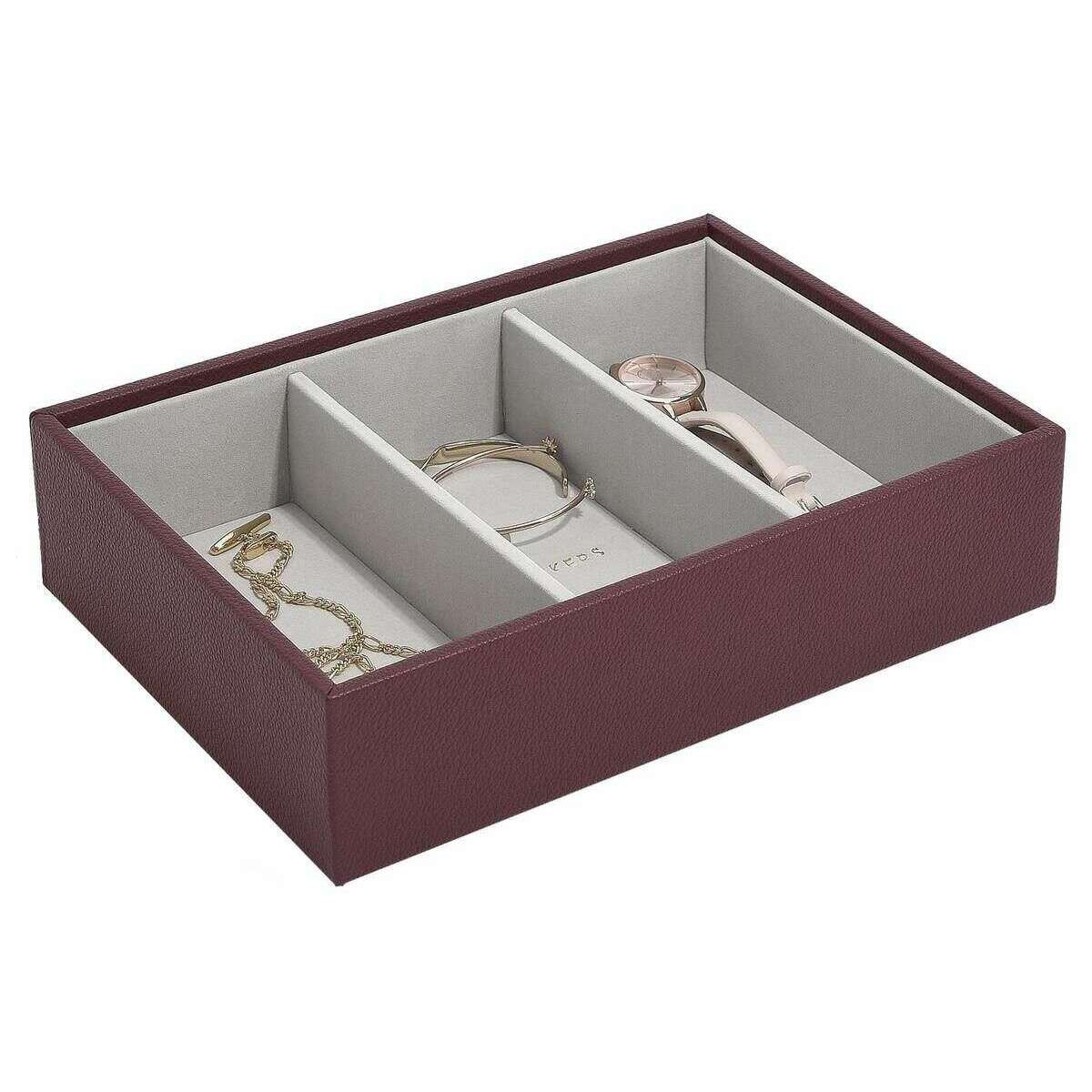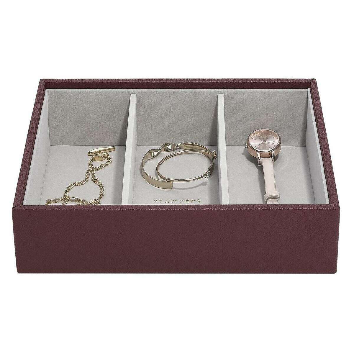 Med vinrött konstläder och sammet är detta klassiska klocktillbehörslager från Stackers perfekt för kvinnor och ett måste. Den mäter 6 cm (höjd) x 25 cm (bredd) x 18 cm (djup). Alla smyckeskrin levereras kompletta med staplarförpackningar. Stackers Classic Watch Accessory Layer - Burgundy har tre större sektioner för alla dina större smycken. Detta vackra vinröda smyckeslager är perfekt för förvaring av större föremål som solglasögon, klockor och armringar.