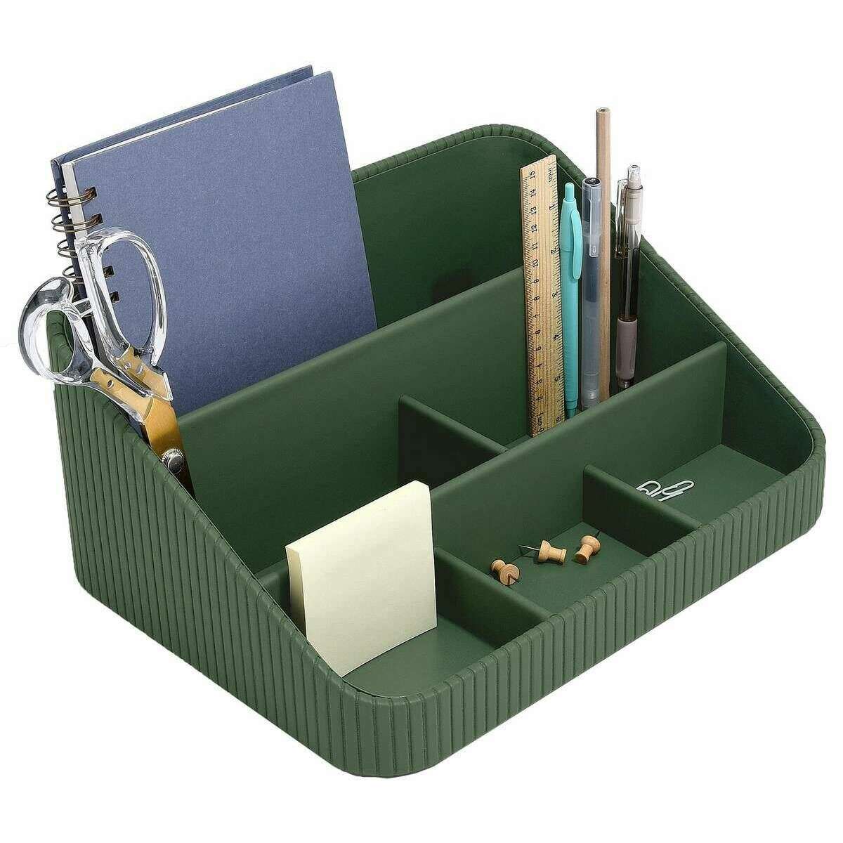 Denna välgjorda skrivbordsarrangör för kvinnor från Stackers kommer i en smaragdgrön färg och är tillverkad av konstläder. Den mäter 14,5 cm (höjd) x 24,5 cm (bredd) x 32,5 cm (djup). Alla skrivbordstillbehör levereras komplett med staplarförpackningar. Stackers Desk Organizer - Emerald Green har en vacker grön design. Denna skrivbordsarrangör har många sektioner för stationära, bärbara datorer och många fler prydnadssaker, allt inom räckhåll!