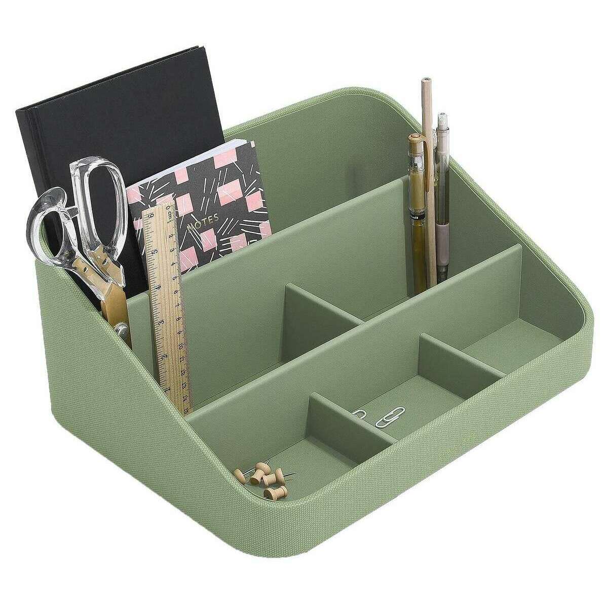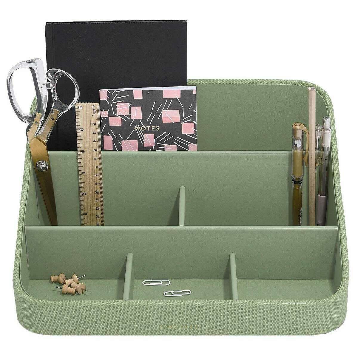 Designer Stackers har gett dig detta skrivbordstillbehör i konstläder för kvinnor med pistagegröna toner. Den mäter 14,5 cm (höjd) x 24,5 cm (bredd) x 32,5 cm (djup). Alla skrivbordstillbehör levereras komplett med staplarförpackningar. Stackers Desk Organizer - Pistachio Green har en vacker grön design. Denna skrivbordsarrangör har många sektioner för stationära, bärbara datorer och många fler prydnadssaker, allt inom räckhåll!