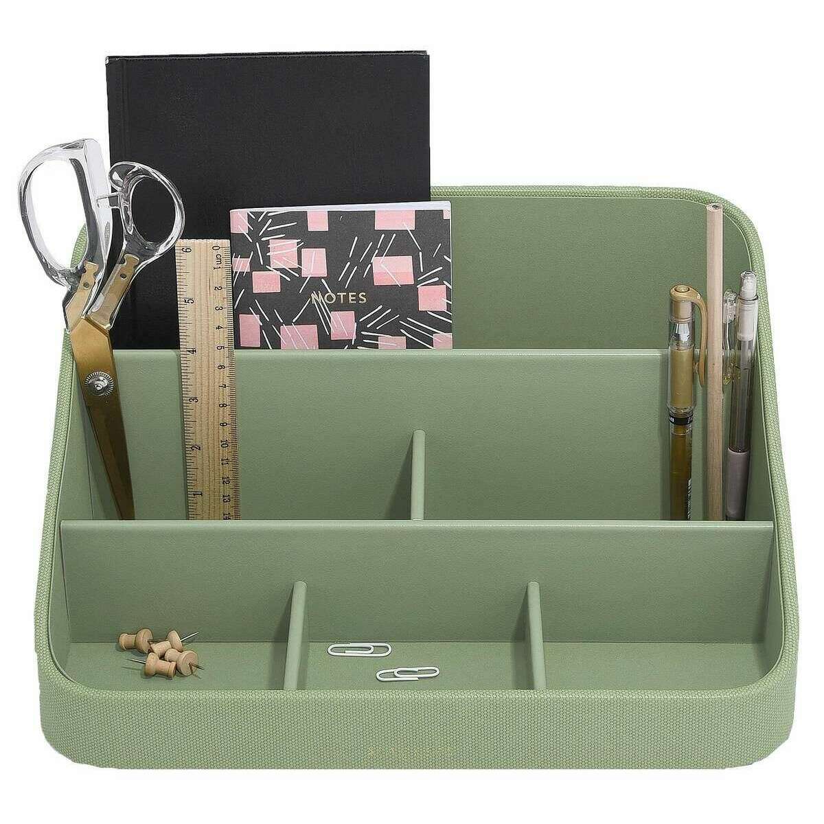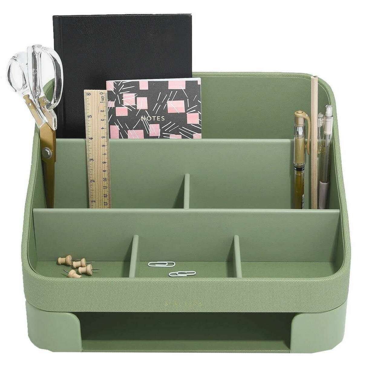 Vi introducerar denna skrivbordsarrangör för kvinnor från Stackers, den är tillverkad av konstläder i en pistagegrön färg. Den mäter 20 cm (höjd) x 25 cm (bredd) x 33 cm (djup). Alla skrivbordstillbehör levereras komplett med staplarförpackningar. Stackers Desk Organizer Set - Pistachio Green har en vacker grön design. Denna skrivbordsarrangör har många sektioner för stationära artiklar, anteckningsböcker och många fler prydnadssaker. Levereras komplett med brevfack för extra förvaring.
