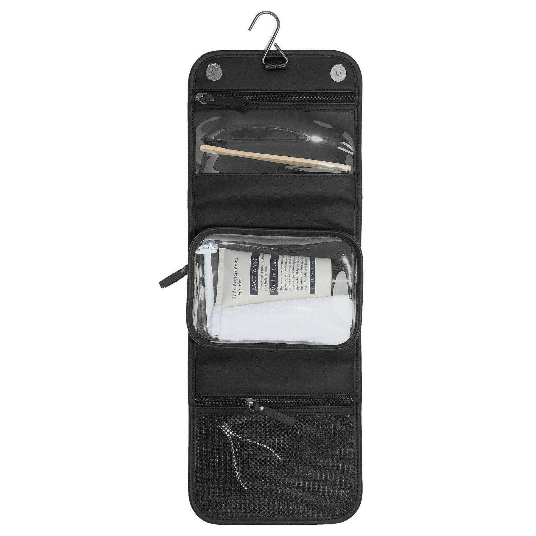 • 2 invändiga fack med dragkedja, avtagbar genomskinlig toalettväska, hängkrok