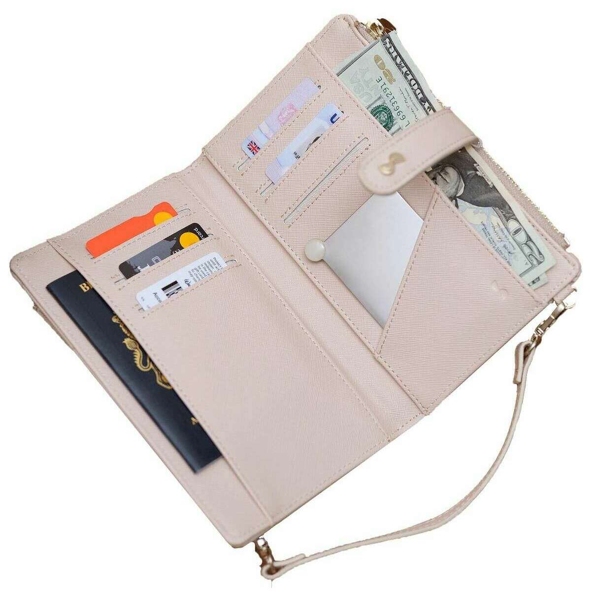• Extern telefonficka, 6 kortplatser, kosmetisk spegel, avtagbar myntficka med dragkedja, avtagbar handledsrem, tryckknappsfäste