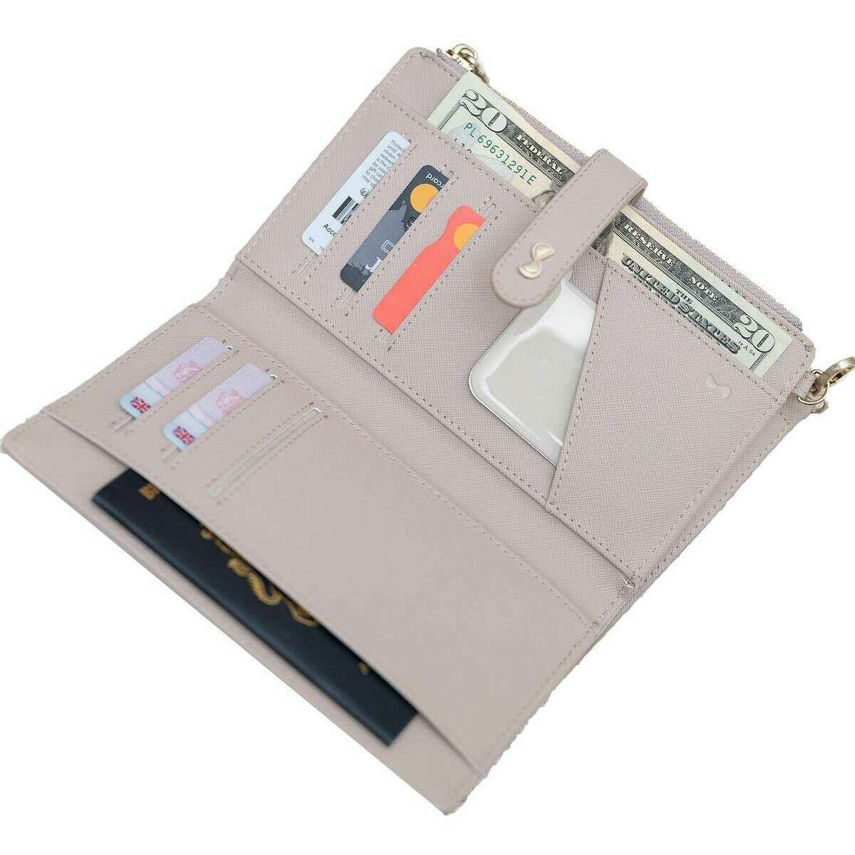 • Extern telefonficka, 6 kortplatser, kosmetisk spegel, avtagbar myntficka med dragkedja, avtagbar handledsrem, tryckknappsfäste
