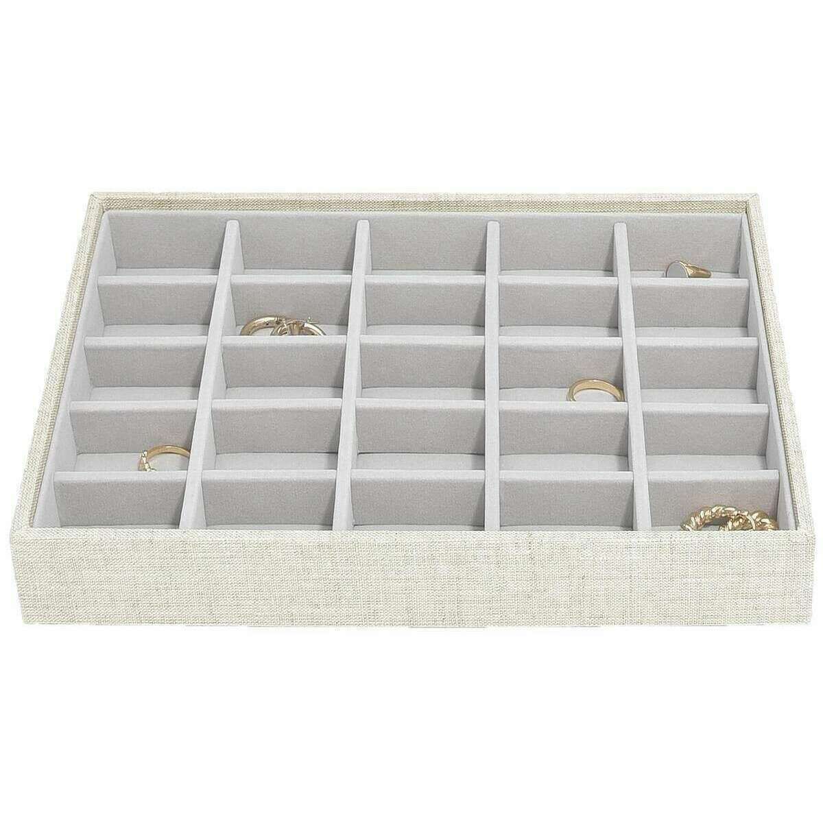 Med hjälp av beige faux läder och linne är denna uppsättning av 5 klassiska smyckeslåda av staplare perfekt för kvinnor och ett måste. Den mäter 24,2 cm (höjd) x 25 cm (bredd) x 18 cm (djup). Alla smycken lådor är komplett i staplar förpackningar. Stackersuppsättningen av 5 klassiska smyckesbox - havregryn/linne beige kommer säkert att imponera med dess otroliga mängd utrymme. Featuring a top lidded section for those precious little pieces, a middle 25 section tray for those charms or rings, another middle tray with three sections to hold your bracelets and necklaces with ring rolls to store more rings and earrings, and then one of the bottom trays is a deep three section box for those larger items like big bracelets, watches and sunglasses and the last bottom tray is a deep open box for large items that need extra space. Gör detta till den mest perfekta smyckesrutan du kan äga med den som erbjuder så mycket på det mest lyxiga sättet.