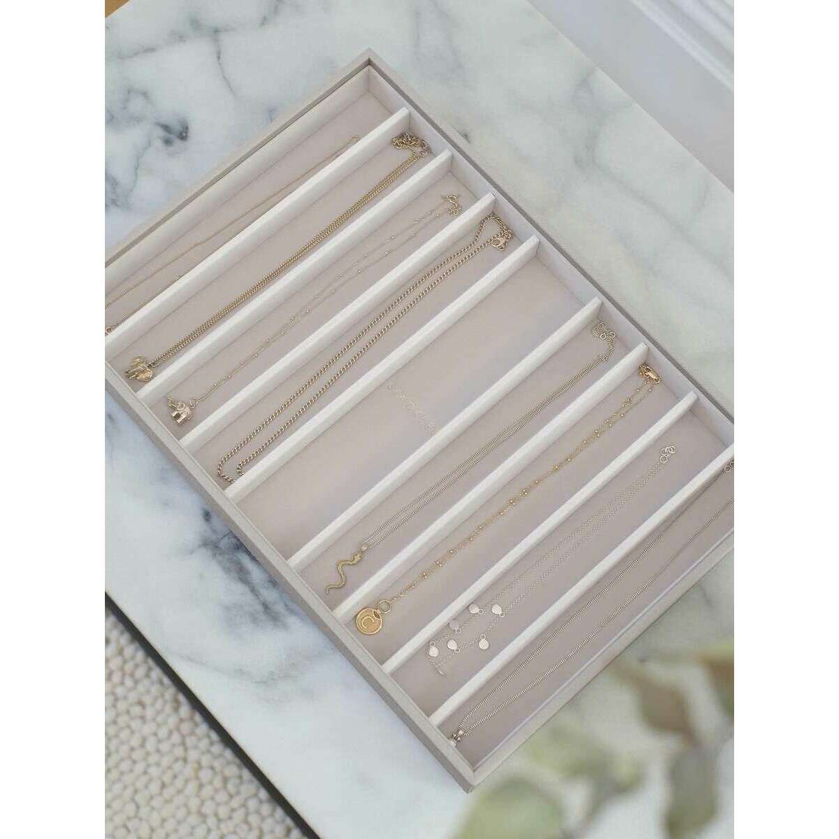 Detta välgjorda halsband i superstorlek för kvinnor från Stackers kommer i en taupe beige färg och är tillverkad av konstläder och sammet. Den mäter 4 cm (höjd) x 36 cm (bredd) x 23,9 cm (djup). Det rekommenderas att torka rent för att hålla denna smyckeskrin i gott skick. Alla smyckeskrin levereras kompletta med staplarförpackningar. Stackers Supersize Necklace Layer - Taupe Beige har designats för att hålla dina halsband organiserade och trasselfria. Med en mjuk sammetsinredning kommer detta säkert att imponera på dem som har massor av smycken att organisera och skydda från att skadas. Den här är perfekt att ha på din byrå eller byrå på grund av sin enkla design som gör att den passar alla rum, eller så kan den kombineras med andra supersize lager för att skapa din perfekta smyckeskrin.