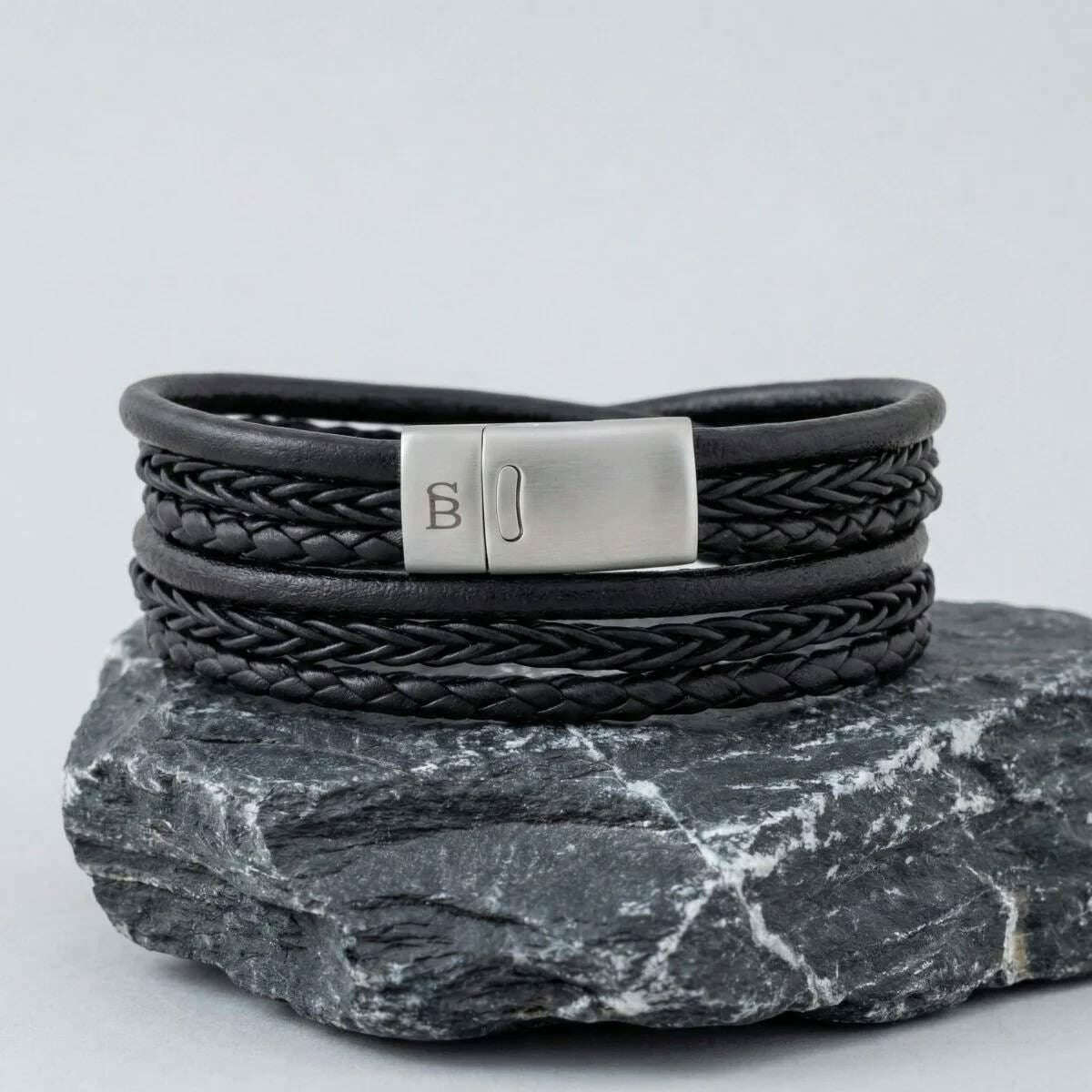 Detta bonacci-lagerarmband av flertrådigt läder för män av märket Steel & Barnett är tillverkat av 100 % koskinn och rostfritt stål och visas i svart. Alla armband levereras kompletta med stål & barnett förpackningar. Steel & Barnett Bonacci Layered Multi-Strand Läderarmband - Svart är ett raffinerat uttryck för hantverk och tidlös stil. Handgjorda av äkta nötskinn av finkvalitet, varje tråd är minutiöst flätad för att skapa en rik, lagerstruktur som talar till både kvalitet och sofistikering. Dess 12 mm bredd erbjuder en djärv men ändå mångsidig närvaro, vilket gör den lämplig för vardagsbruk eller höga tillfällen. Armbandet är färdigt med ett spänne av borstad stål, tillverkad av 316L rostfritt stål för exceptionell hållbarhet och motståndskraft mot korrosion. Dess magnetiska låsdesign säkerställer enkel fastsättning samtidigt som den bibehåller en säker, bekväm passform hela dagen. Bonacci-armbandet är elegant, hållbart och genomtänkt designat och är ett enastående tillbehör som kompletterar modern stil med en klassisk touch.